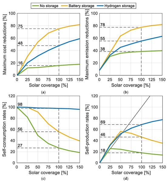 KPI of solar integration strategies: (a) cost reductions, (b) emission reductions, (c) self-consumption rates, (d) self-production rates.