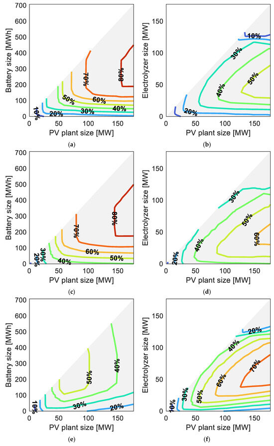 Figure 6 illustrates iso-curves of cost and emission reductions and renewable self-production rates under varying sizes of solar PV plants, battery storage, and PEM electrolyzers. It is important to note that these figures do not show the different boosting levels that undermine the maximum reductions or self-sufficiency levels. As can be seen, increasing the size of the battery storage or of the PEM electrolyzer is not always beneficial. Indeed, while undersized equipment cannot exploit the entire electricity excess, oversized equipment would operate for a limited number of equivalent hours. Cost and emission reductions patterns in the battery configuration are similar to cost and emission reductions and self-consumption rate patterns in the hydrogen configuration, which increase with the size of the PV plant. Conversely, in the battery configuration, self-production rates may decrease as the size of the solar plant increases, due to greater electricity surpluses.