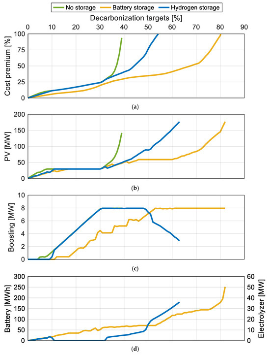 Shifting from operational considerations to more comprehensive technoeconomic evaluations, Figure 7 shows the variation of cost premiums and capacity requirements for PV plants, furnace boosting, battery storage, and PEM electrolyzers. It is worth noting that furnace boosting refers to additional values with respect to the nominal conditions of 1 MW.