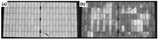 Representative rear-side EL images at nameplate for a module (a) before and (b) after PID-p degradation.