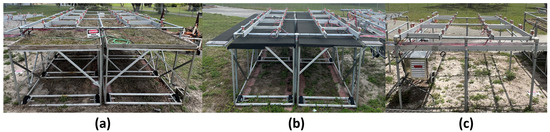 A total of 16 bifacial PERC modules were installed on a high-voltage (HV) testbed at the Florida Solar Energy Center (FSEC) in Cocoa, FL. The testbed was designed with racks which simulate different installation conditions: one rack for simulated ground, one rack for residential rooftop, and two open racks, shown in Figure 2a, Figure 2b, and Figure 2c, respectively (only one open rack is shown). Ground installation was simulated using a rolling structure with an open box on the top for soil. For residential rooftop, a rolling structure covered with black ethylene propylene diene monomer shingles.
