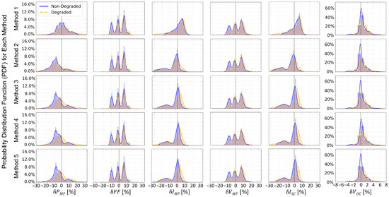 Probability Distribution Functions (PDFs) for each parameter obtained for each method. Blue bars with solid blue lines represent non-degraded modules; orange bars with dashed orange lines represent degraded modules. Each bar represents a bin of 1%. Colored lines show kernel density estimations. The vertical black line is a visual guide for percent error of parameter , , equal to 0%. Each row shows the results for methods 1–5 from top to bottom. Each column shows the distribution of between the outdoor parameter and the transformed indoor I–V curve. Left to right, they show , FF, , , , and . Note the scaling for the x-axes and y-axes for all parameters is the same except for .