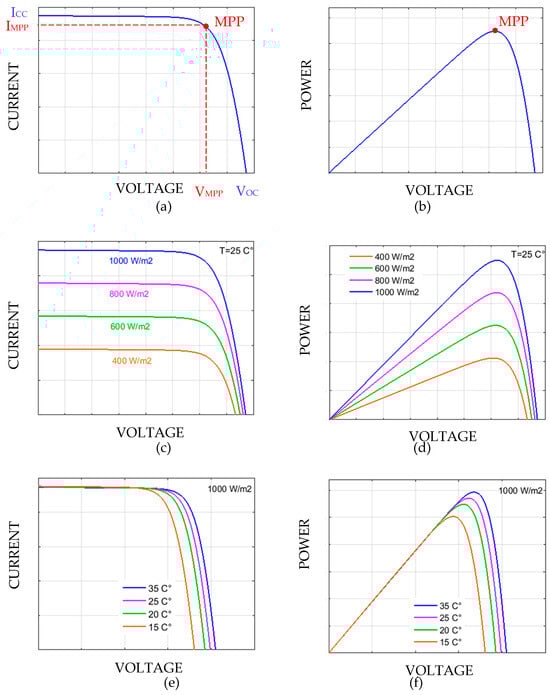 The performance of a photovoltaic panel is simulated to illustrate the effects of varying irradiance and temperature. It can be seen in Figure 1c,d that as irradiance increases, the power output and current of the system also increase. On the other hand, higher temperatures lead to a noticeable decrease in output voltage and overall power, as shown in Figure 1e,f. These trends confirm the strong dependence of photovoltaic performance on environmental conditions, particularly, solar irradiance and temperature.