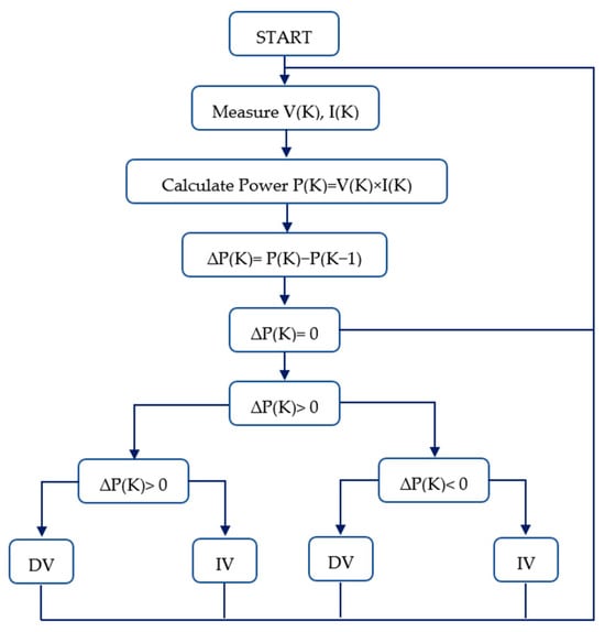 The P&O MPPT technique is traditionally implemented using either fixed or adaptive step sizes, allowing for various enhancements in tracking performance [22]. A schematic representation of the algorithm’s operational flow is illustrated in Figure 2.