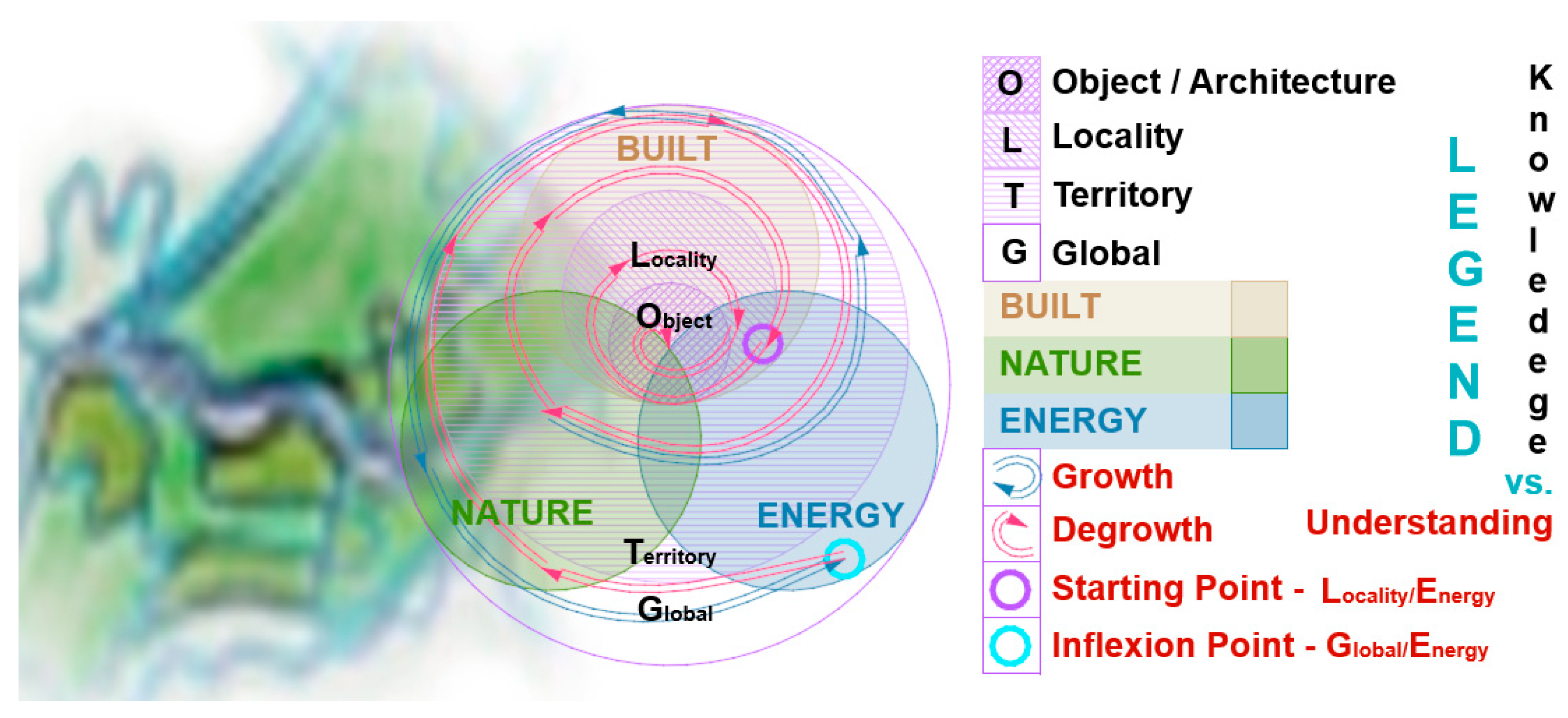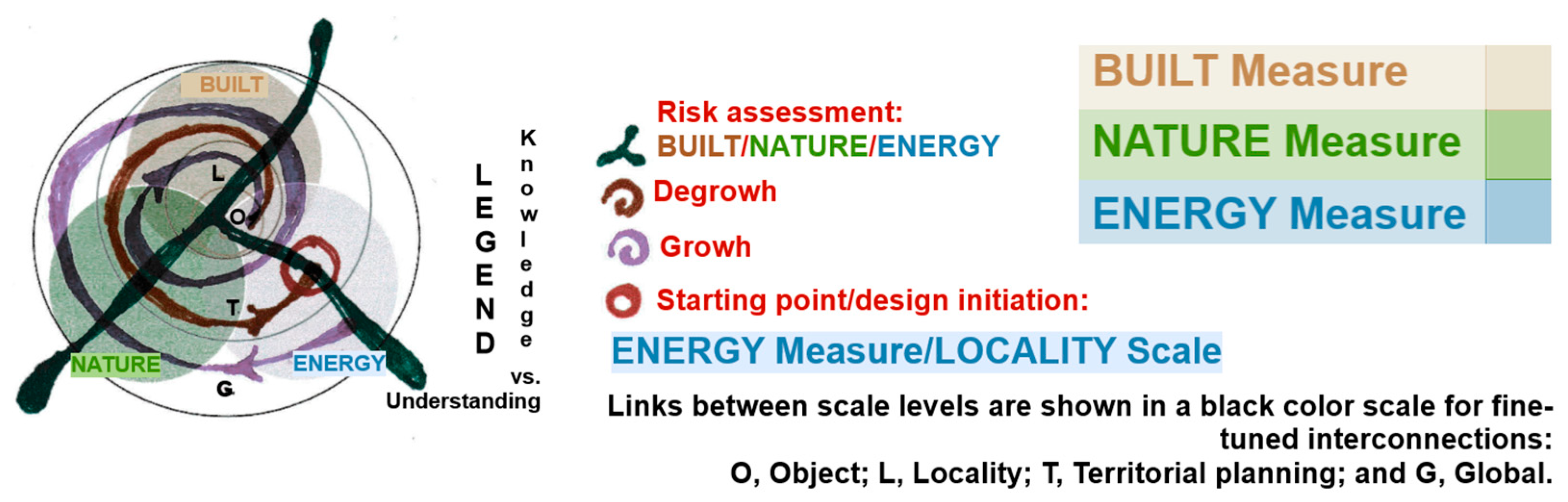 The Hegelian dialectic provides a framework for development in a one-way spiral. However, Bennett’s triads represent a way of gaining and re-gaining through a two-way spiral covering the “knowledge” necessary for achieving “understanding” and making a multicriteria decision essential in any holistic solution. The spiral notes the equal weight of the knowledge metaphors in the creation of the rosette: B—BUILT + N—NATURE + E—ENERGY on the scales, from small to large, of O—Object, L—Locality, T—Territory, and G—Global, applied to projects at any starting points.