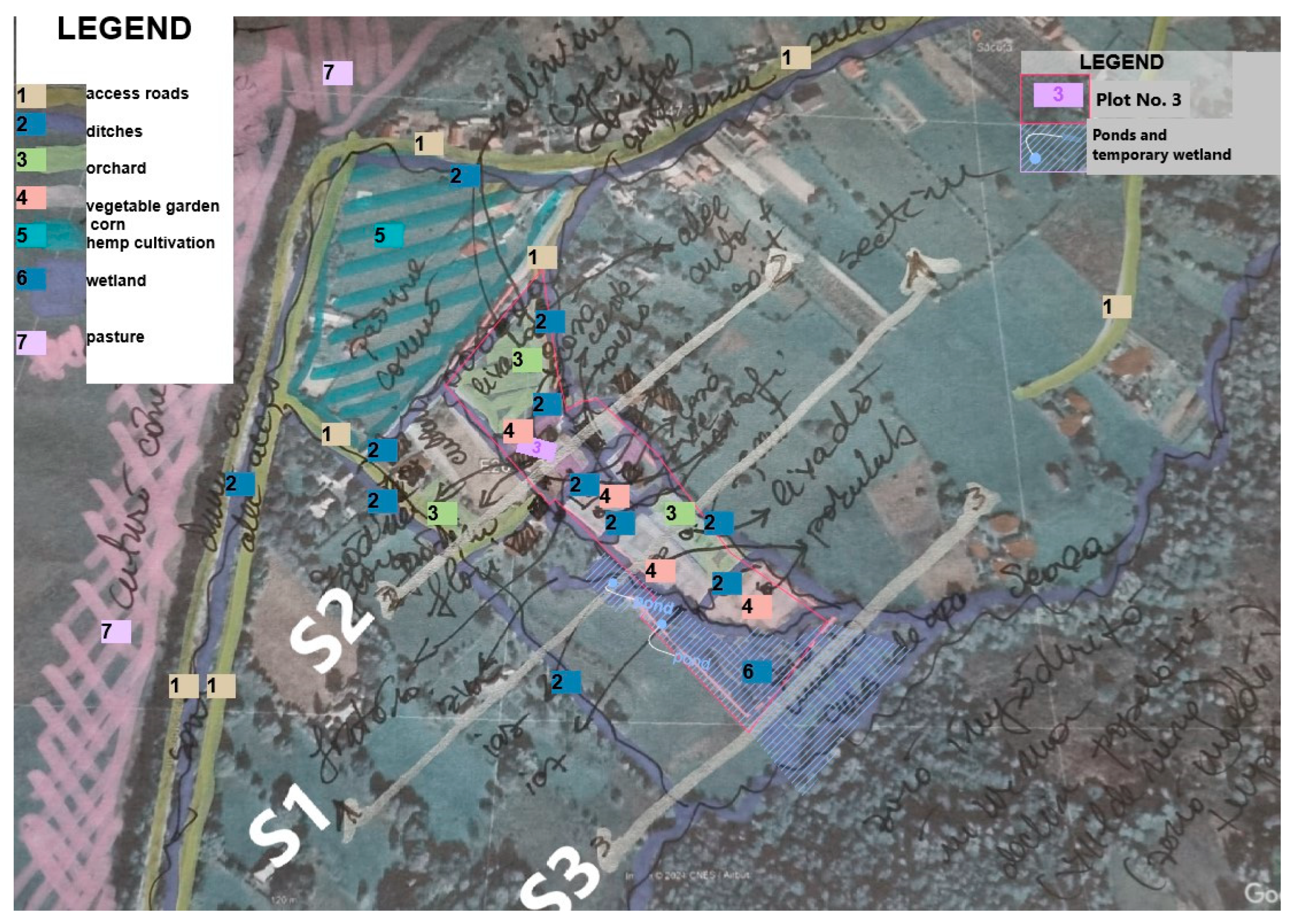 Figure 5b shows other sketches of the No. 3 plot, Ilie C.’s plot, and traditional landscaping (sketched plan and land sections) in [S-SV]. Every part of Plot No. 3 was landscaped in a family-oriented, almost urbanistic design environment, featuring a house with a front flower garden, a yard, a vegetable garden, a beehive area, a cornfield, and a pasture, all delimited by numerous ditches and a natural wetland with a pond area. The pond continues to be set until the watercourse, the natural wetland for most of the year, is bounded by the Seaca watercourse.