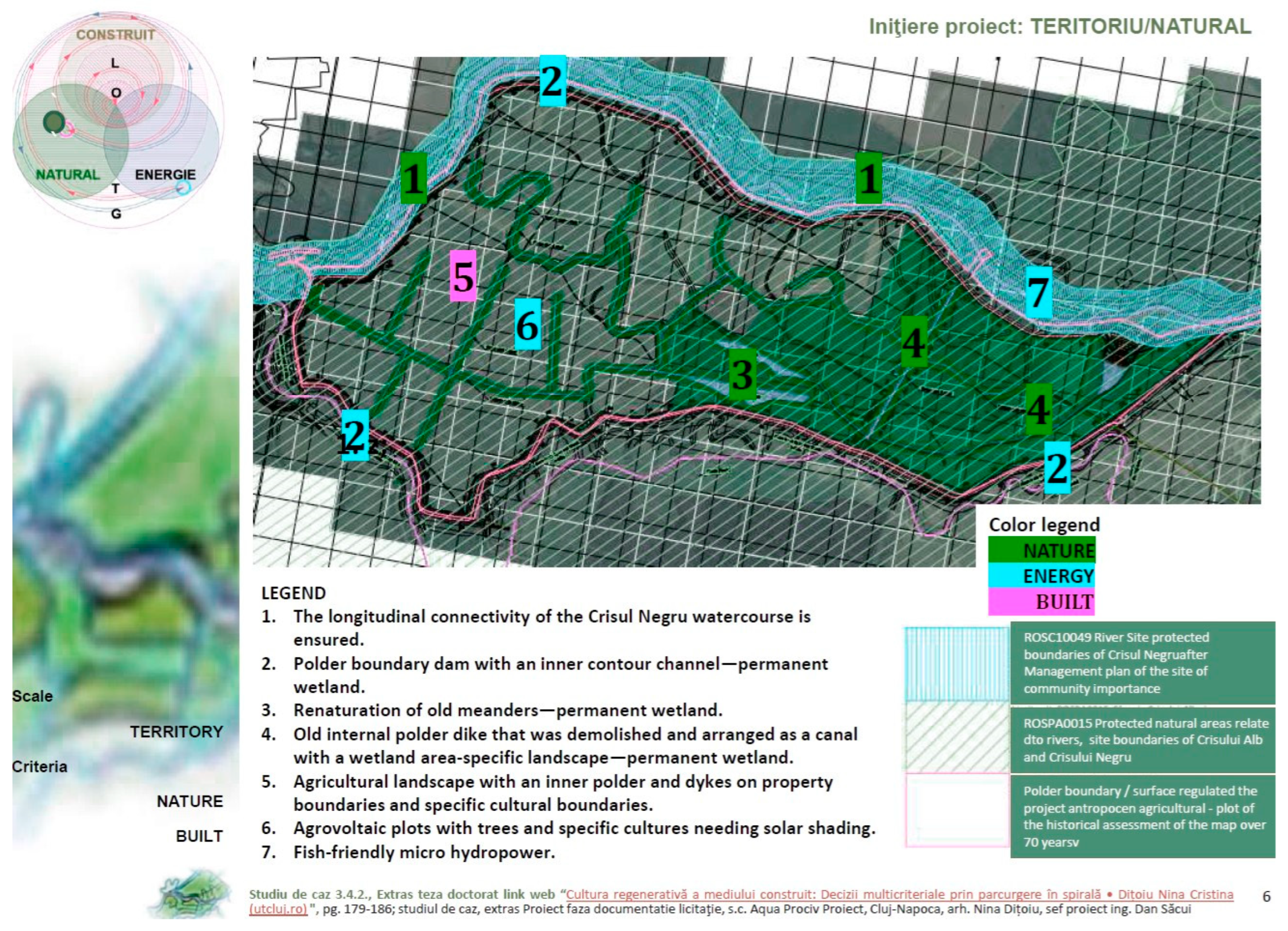 The TRIAD for small-scale regeneration proposes re-naturalisation for NATURE, rehabilitation for BUILT, and solar energy production for ENERGY in the particular Romanian polder. NATURE—By restoring the courses of the old meanders and replacing the inner dykes space in the polders as with canals in the wetlands, the wetland landscape works.