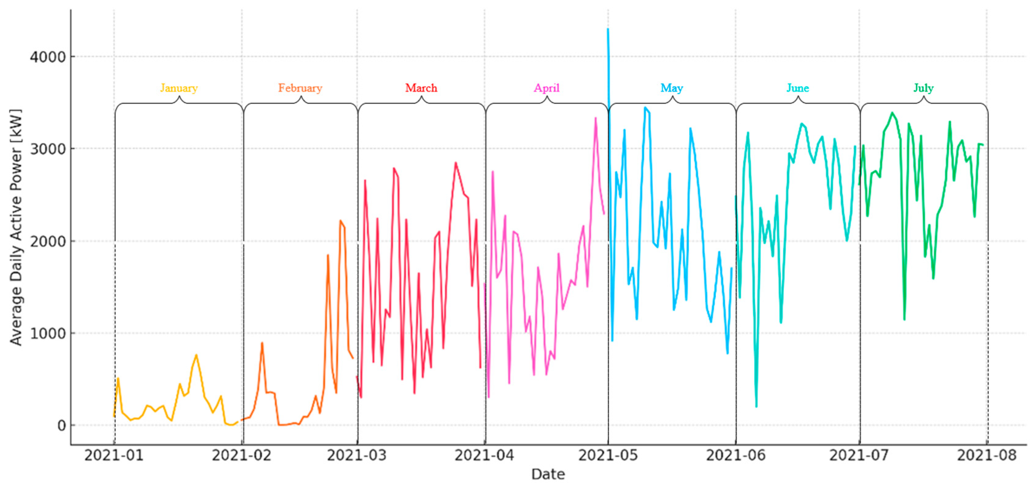 Figure 4 visualises the evolution of daily average PV power output throughout the observation period, highlighting both the seasonal trajectory and the variability in daily generation within each month. Unlike aggregated hourly profiles (