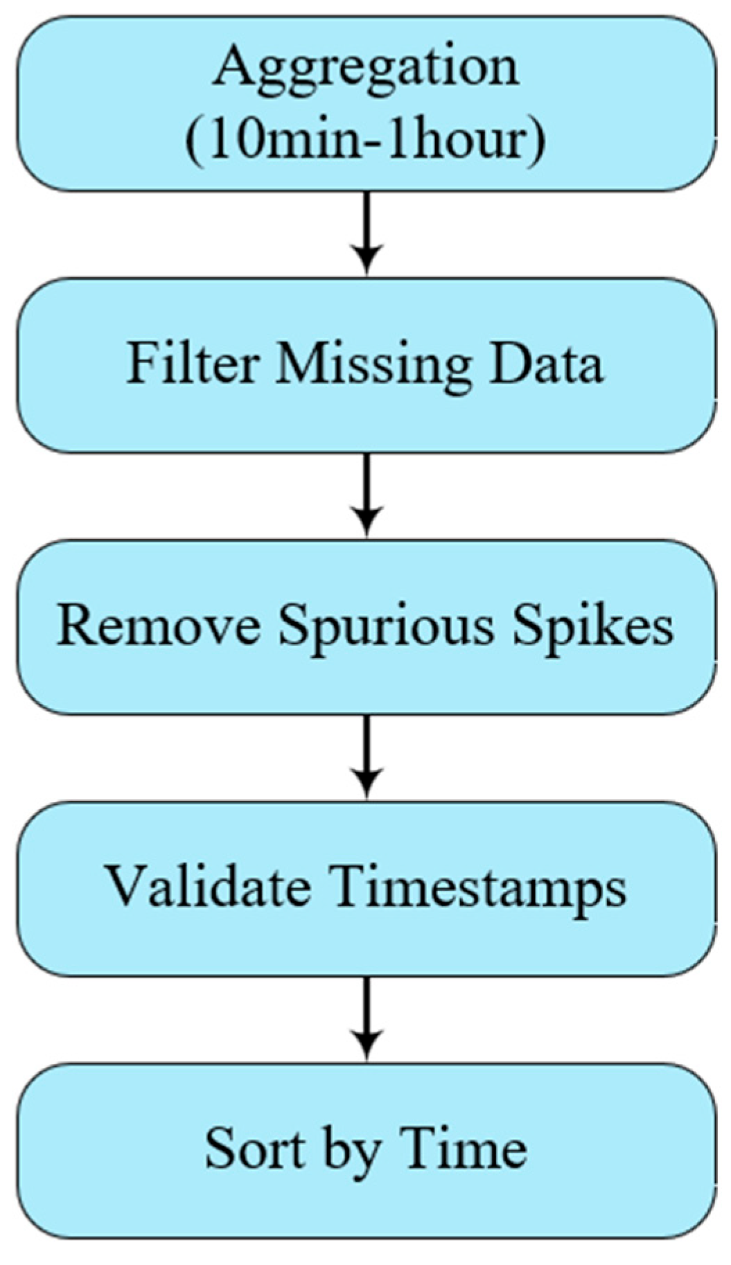 Before applying forecasting methods, the raw dataset was subjected to a comprehensive preprocessing procedure to ensure data quality, temporal consistency, and suitability for time series analysis. A visual overview of the preprocessing workflow is presented in