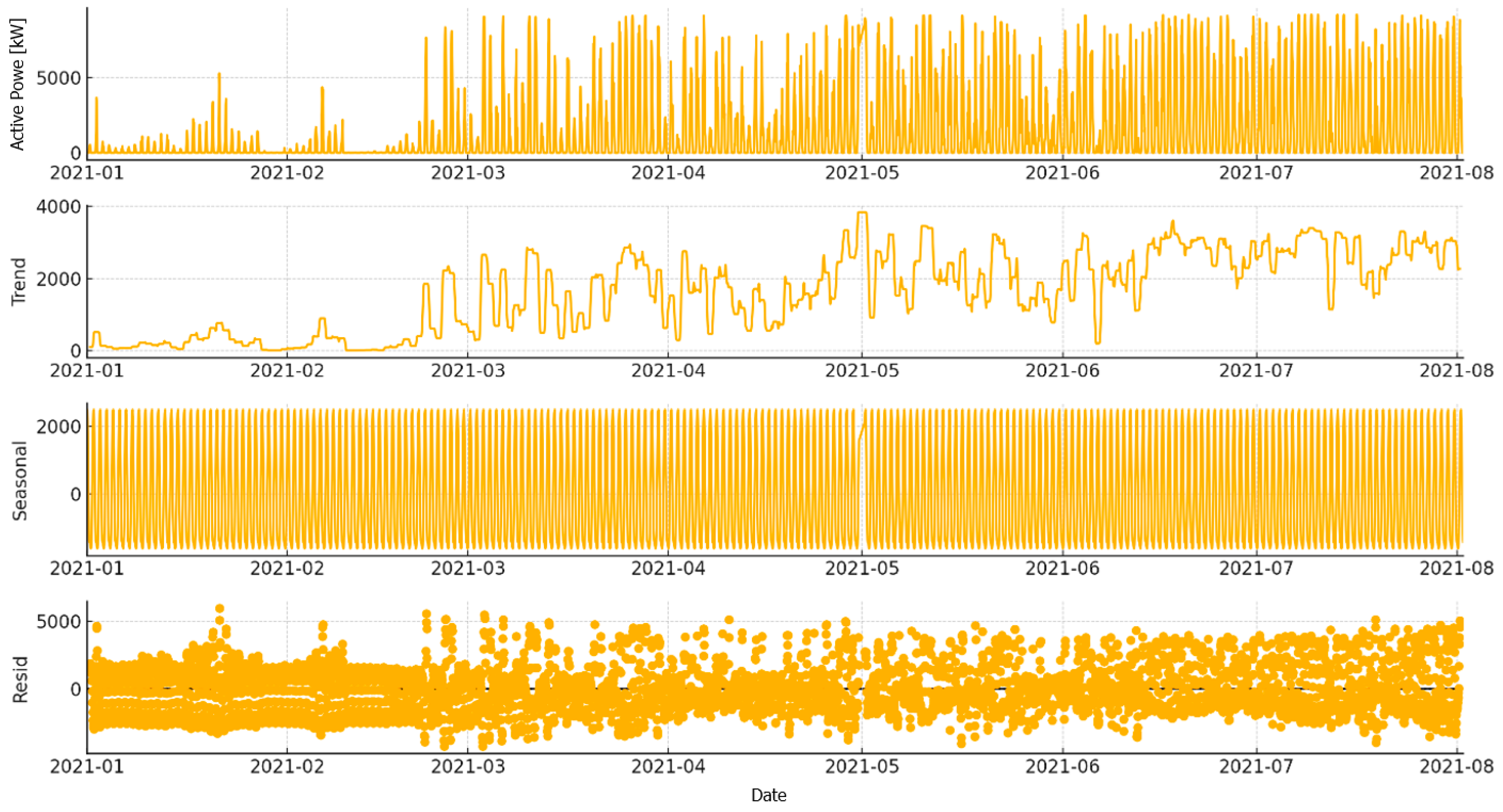 Figure 1, the active power time series exhibits strong daily seasonality, with a notable variation in seasonal amplitude. The winter months are characterised by lower daily peaks, while the summer months show higher and broader daily fluctuations. This behaviour is consistent with the physical nature of solar irradiance, which changes seasonally due to astronomical and meteorological factors. To verify the type of seasonality, seasonal decomposition of the time series was performed using both additive and multiplicative models. The decomposition results are presented in