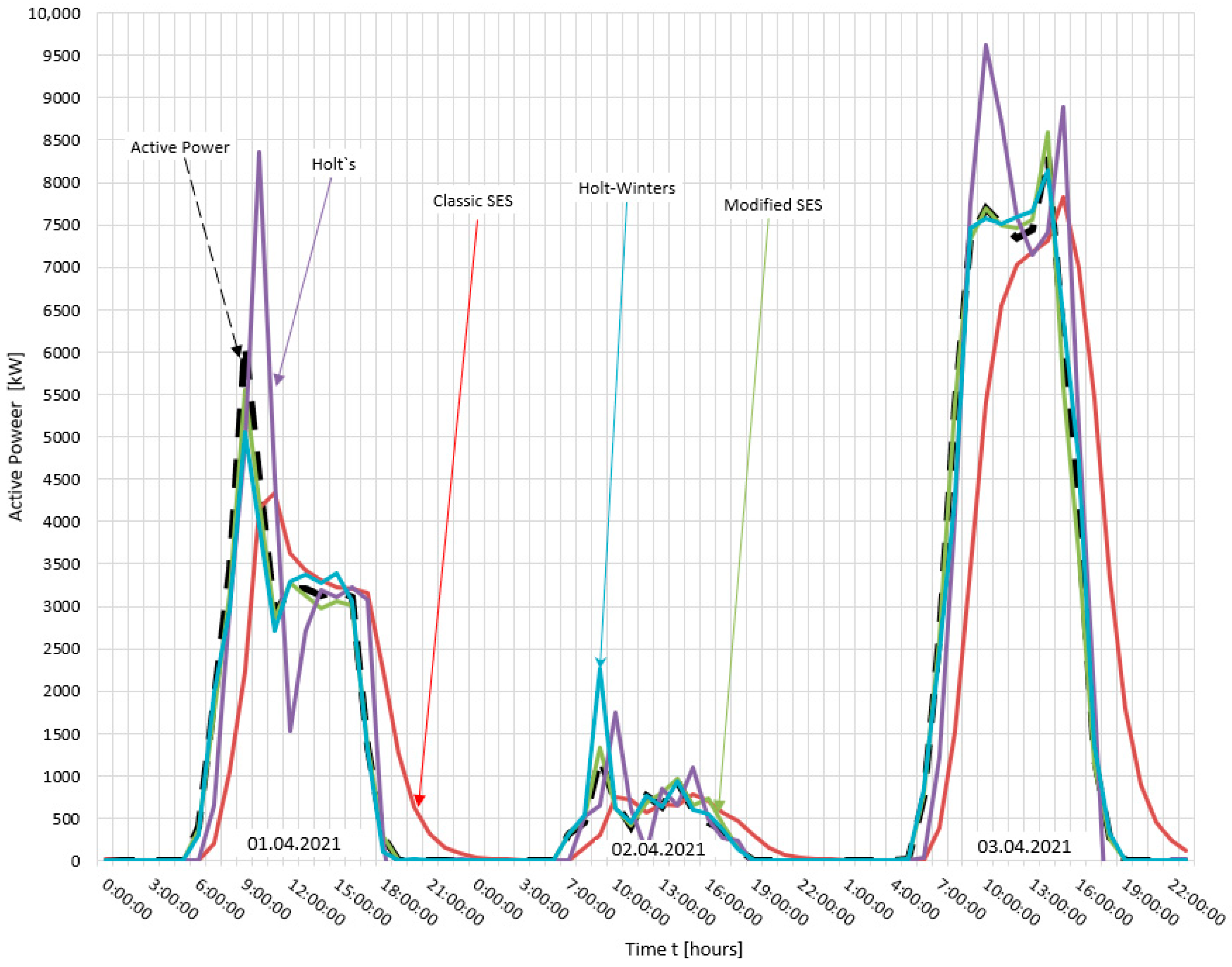 On 1 April, the classic SES model exhibits a delayed response to the morning ramp-up and significantly overestimates evening values. Its forecast trajectory lacks the necessary reactivity to track the rapid power increases and decreases typical of clear-sky days. Conversely, the modified SES and Holt–Winters models follow the actual power curve closely, accurately reflecting both the magnitude and shape of the generation peak. This suggests superior adaptability to daily solar patterns.