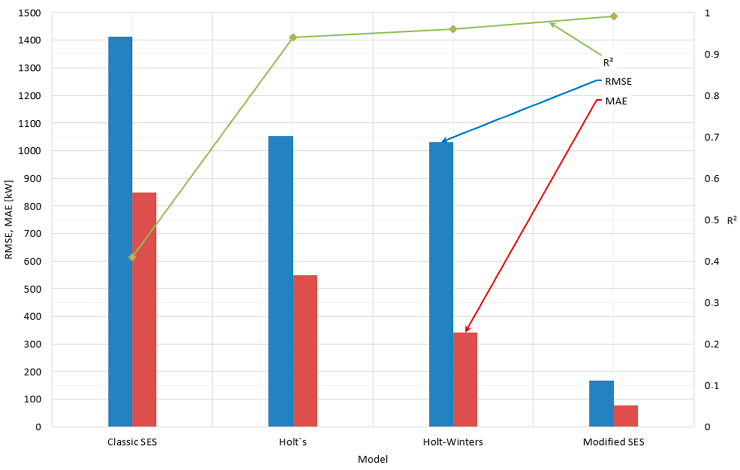 Most remarkably, however, the modified SES model, explicitly tailored in this study by incorporating previous-day, same-hour values into its forecasting structure, significantly outperformed all other models. With the lowest recorded RMSE (166.45 kW) and MAE (77.46 kW), along with exceptionally high R2 (0.99), this modification demonstrated superior predictive accuracy and consistency. The substantial improvement in forecasting precision can be explained by its direct alignment with the repetitive daily cycle inherent in PV power. This modification not only leveraged recent historical data but also effectively integrated the critical diurnal pattern, dramatically enhancing forecast reliability.