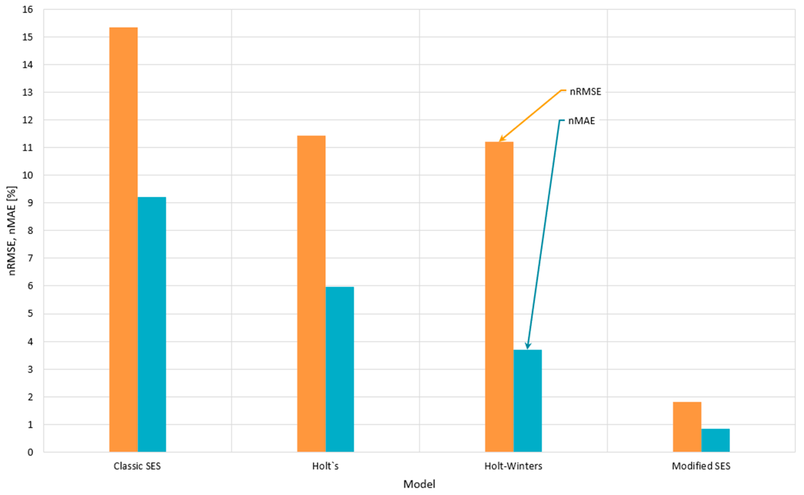 Overall, the results underscore the importance of tailoring forecasting models to the specific temporal structure of PV power. Classic Simple Exponential Smoothing, benefits from adaptation to daily cycles of solar output. The Modified Simple Exponential Smoothing shows that even simple model, when aligned with domain-specific patterns, can offer an attractive accuracy–efficiency–interpretability balance for real-time use in grid-connected and decentralised settings.