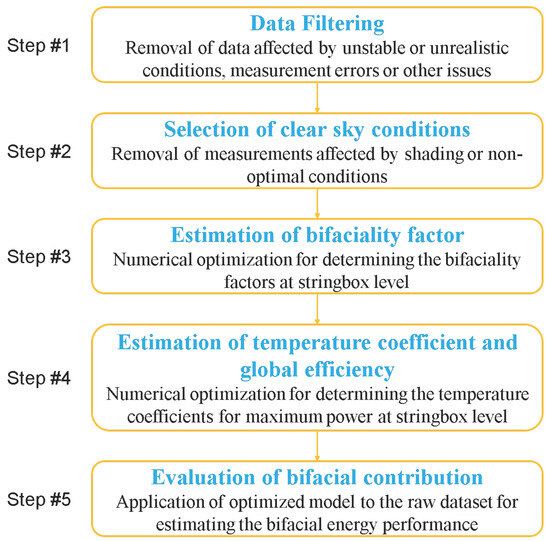 The optimization procedure is split into two steps. The model proposed in this work is based on the Osterwald model, which is the most common in the literature; this model is semi-empirical and states a proportional relationship between DC power and incident irradiance, with the temperature contribution modelled using a proper coefficient. However, the formulation of the Osterwald model is not specifically tailored for bifacial photovoltaic technologies. To address this limitation, an improved version of this model has been employed to take into account bifacial performance. This additional contribution is modeled by a coefficient, namely the bifaciality factor, which is defined as the ratio between the rear and the front power outputs of bifacial PV modules. This improved formulation has been subject to an optimization procedure to numerically determine two quantities: the bifaciality factor and the efficiency taking into account losses due to dirt, reflection, mismatch, MPP tracking, and others. Indeed, an optimization has been carried out for the following equation: