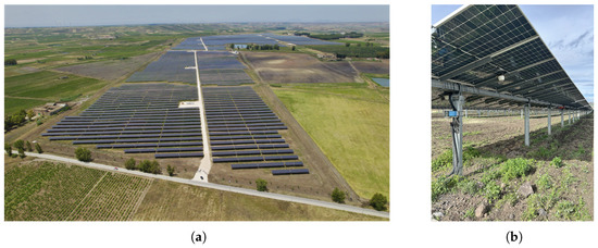 Aerial view and bifacial modules in the PV plants under study. (a) Aerial view of plant #1 (66 MW). (b) Bifacial PV modules in plant #2 (39 MW).