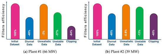 This section presents the results of the analysis. The operation of the two systems began in January 2023 and June 2023, respectively, and the model should be optimized on data acquired in the first operation months to exclude degradation and underperformance phenomena. However, in this work, the energy model has been optimized on data acquired in April 2023 (PV plant #1) and July 2023 (PV plant #2), which were not the first operation months. This decision was made because the operation of plant #1 started in winter months, without favorable weather conditions, while the operation of plant #2 began at the end of June 2023, without a complete set of data for June. Regarding step #1 of the methodology, Figure 3 presents the amount of data removed after the application of each filter individually with respect to the full dataset for the two plants.