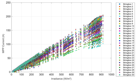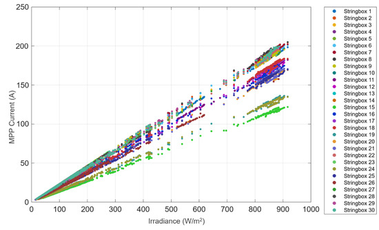 Regarding step #2, the selection of reference conditions was performed to exclude data affected by shadowing and underperformance. Figure 4 presents the relationship between DC current at the maximum power point and the front irradiance for the stringboxes of one inverter in plant #1. Figure 4 exhibits a strongly nonlinear correlation between the two quantities, and this is due to non-optimal operation. After the selection of the reference conditions, Figure 5 exhibits a clearly linear trend between the two quantities.