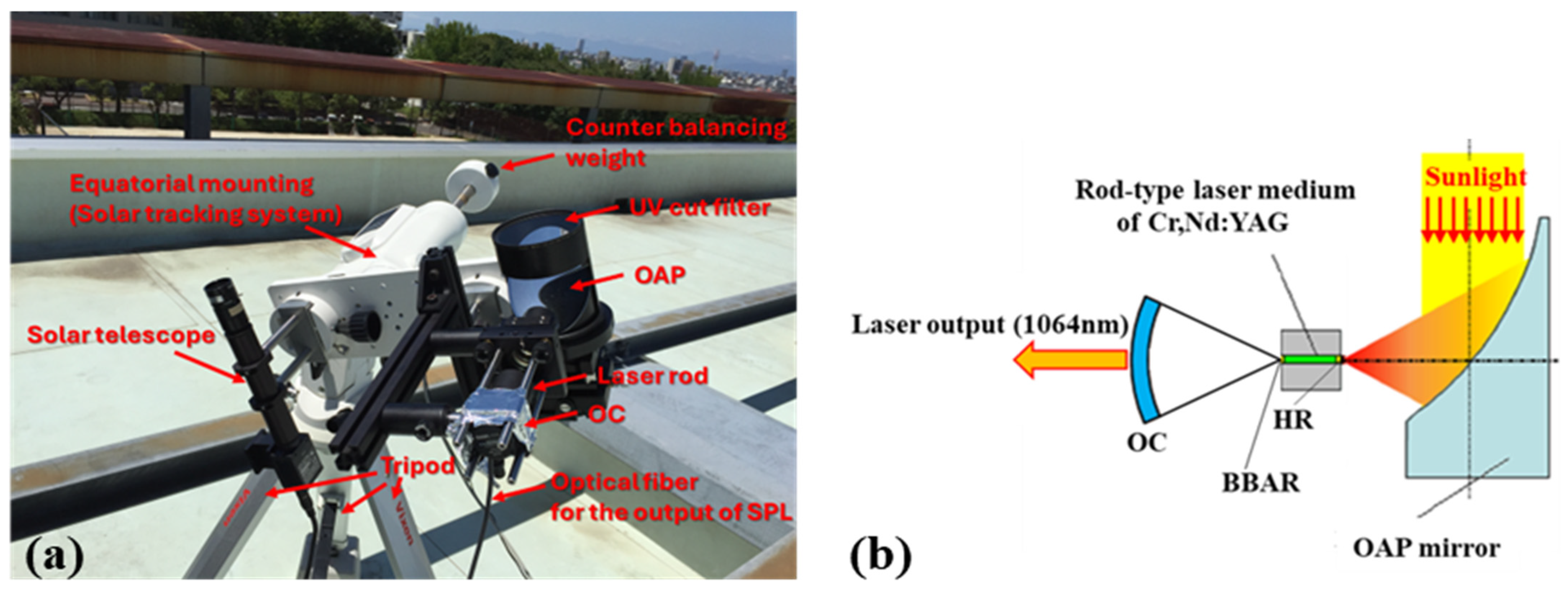 - Kato, T.; Ito, H.; Hasegawa, K.; Ichikawa, T.; Ikesue, A.; Mizuno, S.; Takeda, Y.; Ichiki, A.; Motohiro, T. Effect of Cr content on the output of a solar-pumped laser employing a Cr-doped Nd: YAG ceramic laser medium operating in sunlight. Jpn. J. Appl. Phys. 2019, 58, 062007. [Google Scholar] [CrossRef]