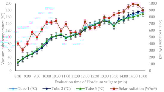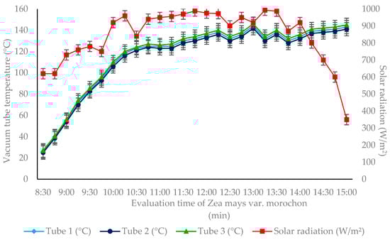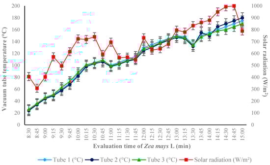 Figure 4 shows the evolution of the temperature in three vacuum tubes, as well as the intensity of solar radiation during the cooking process of Zea mays L. between 8:30 a.m. and 3:00 p.m. There is a sustained increase in the temperature of the tubes, reaching values above 180 °C as time progresses. This behavior is strongly correlated with the dynamics of solar radiation, which varied between 600 and 980 W/m2 during the period evaluated. The corn reached the desired cooking point after 1 h and 45 min, under an average solar radiation of 888 W/m2, demonstrating the system’s ability to efficiently transfer solar energy to the food. The three temperature curves showed consistent thermal behavior, with minimal variability between tubes, attributable to the uniform distribution of incident radiation in the collector. The associated error bars reflect adequate experimental repeatability.