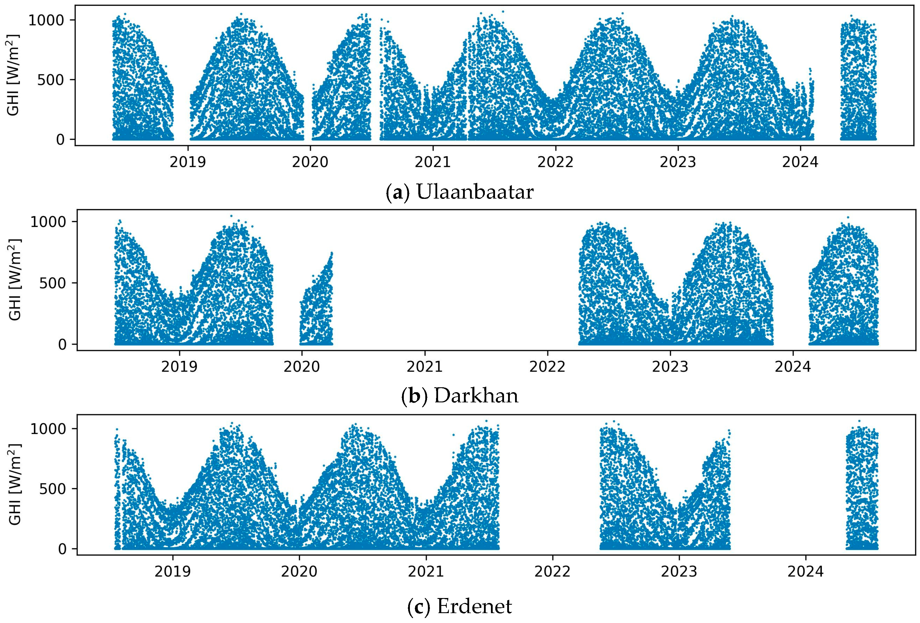 To ensure the completeness and reliability of the input sequences, any day containing missing data is entirely excluded. This filtering results in 2050, 1340, and 1553 complete daily records for Ulaanbaatar, Darkhan, and Erdenet, after discarding 12, 6, and 4 incomplete days of measurements, respectively. Figure 1 illustrates the hourly average GHI values recorded at these locations. While continuous measurements are ideal for capturing daily, seasonal, and interannual solar patterns, the dataset includes extended periods of missing data, sometimes exceeding one year, primarily due to power outages or equipment maintenance issues. Nevertheless, since each site contains at least three years of measurements with a fairly balanced seasonal coverage (a slight bias toward summer months), no interpolation or data imputation methods are applied; the original observations are retained as they are.