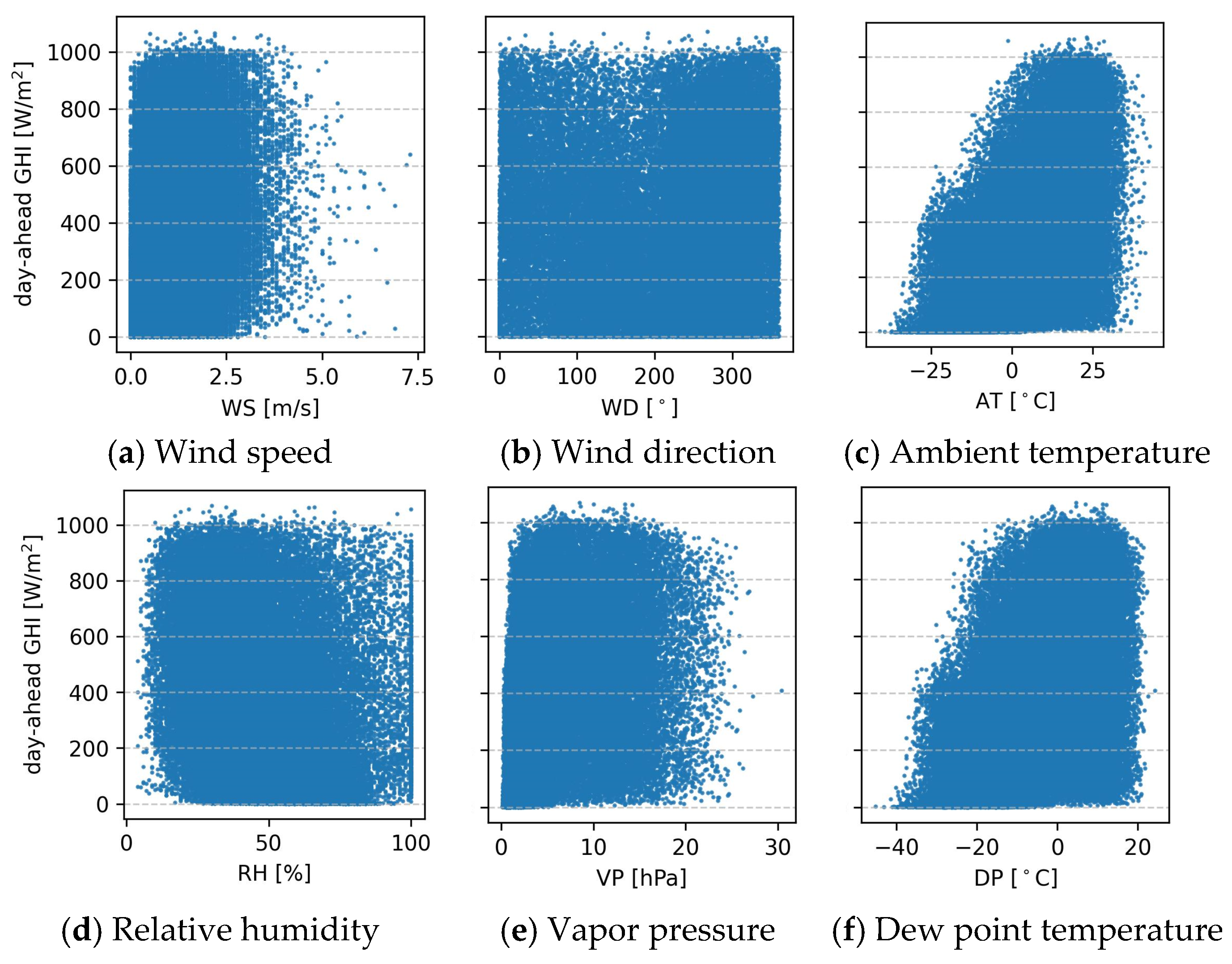 Table 3. The correlation coefficients between the input features and the output target (day-ahead GHI). Input features are abbreviated as: wind speed (WS); wind direction (WD); ambient temperature (AT); relative humidity (RH); vapor pressure (VP); dew point temperature (DP); cloud cover (CC); hour of the day (HH); day number (DN); clear sky global horizontal irradiance (CS GHI); solar zenith angle (ZA) and azimuth angle (AA).