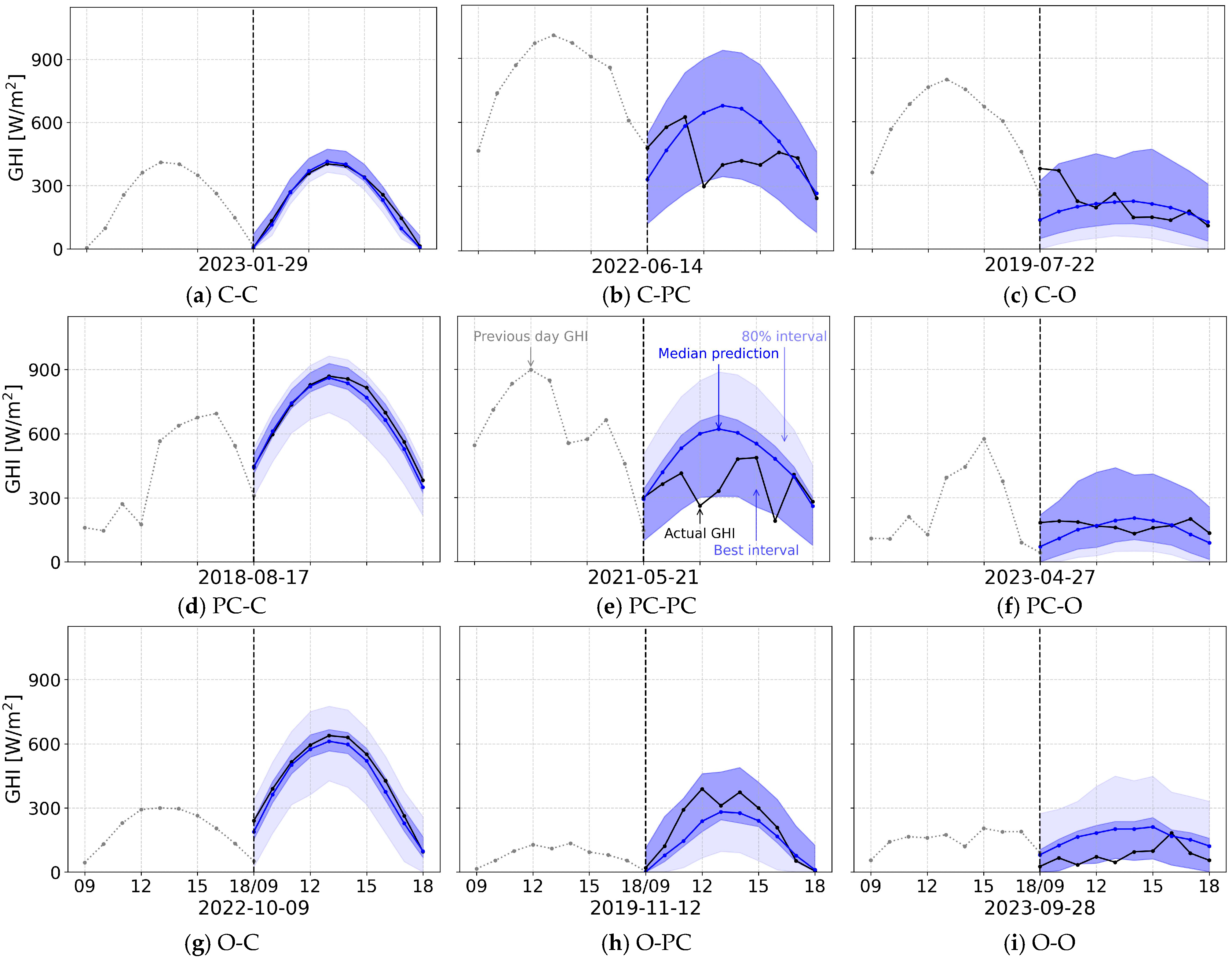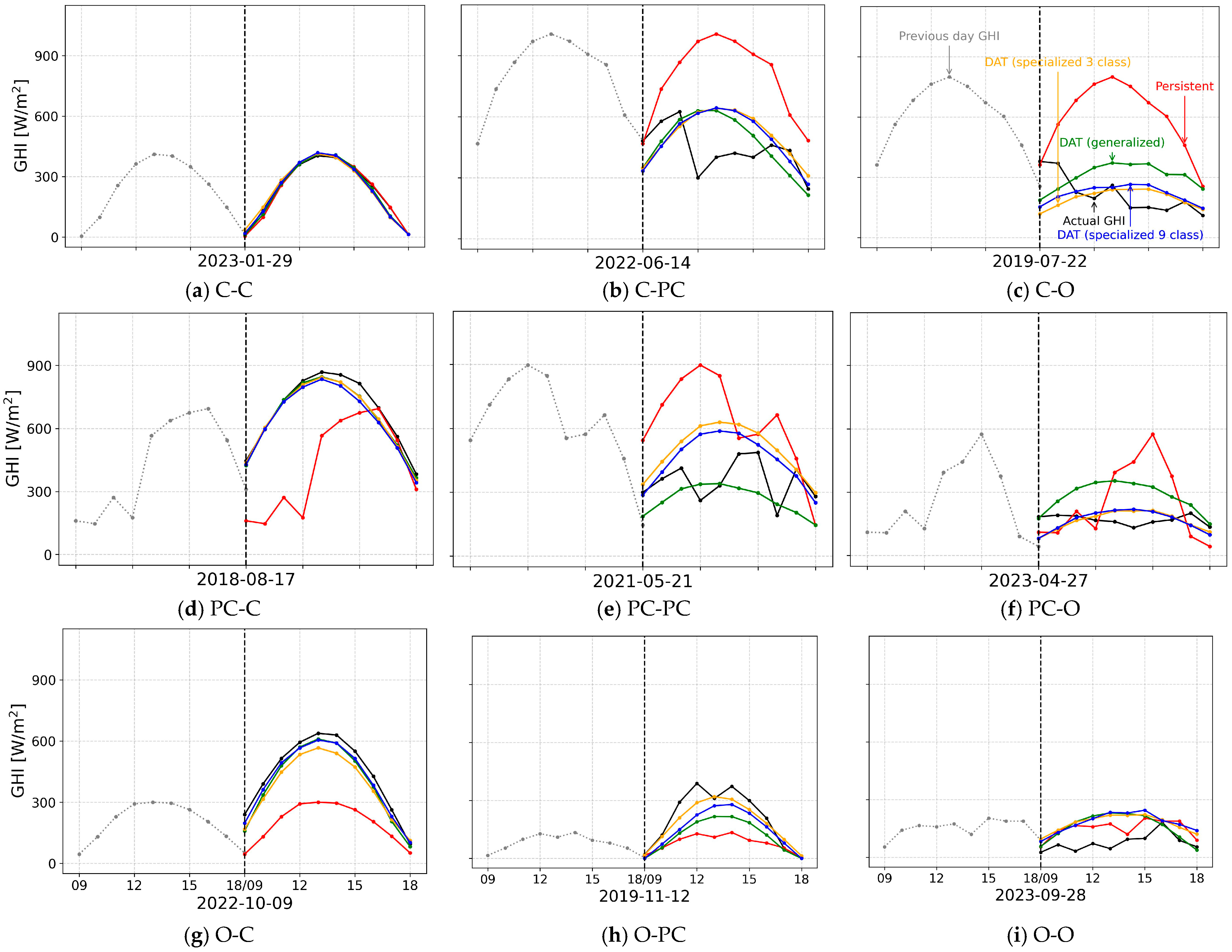 Figure 8. Forecasting under different sky condition transitions. The vertical axis shows the GHI in W/m2, while the x-axis title shows the forecast date. The vertical dashed line shows the forecast start.