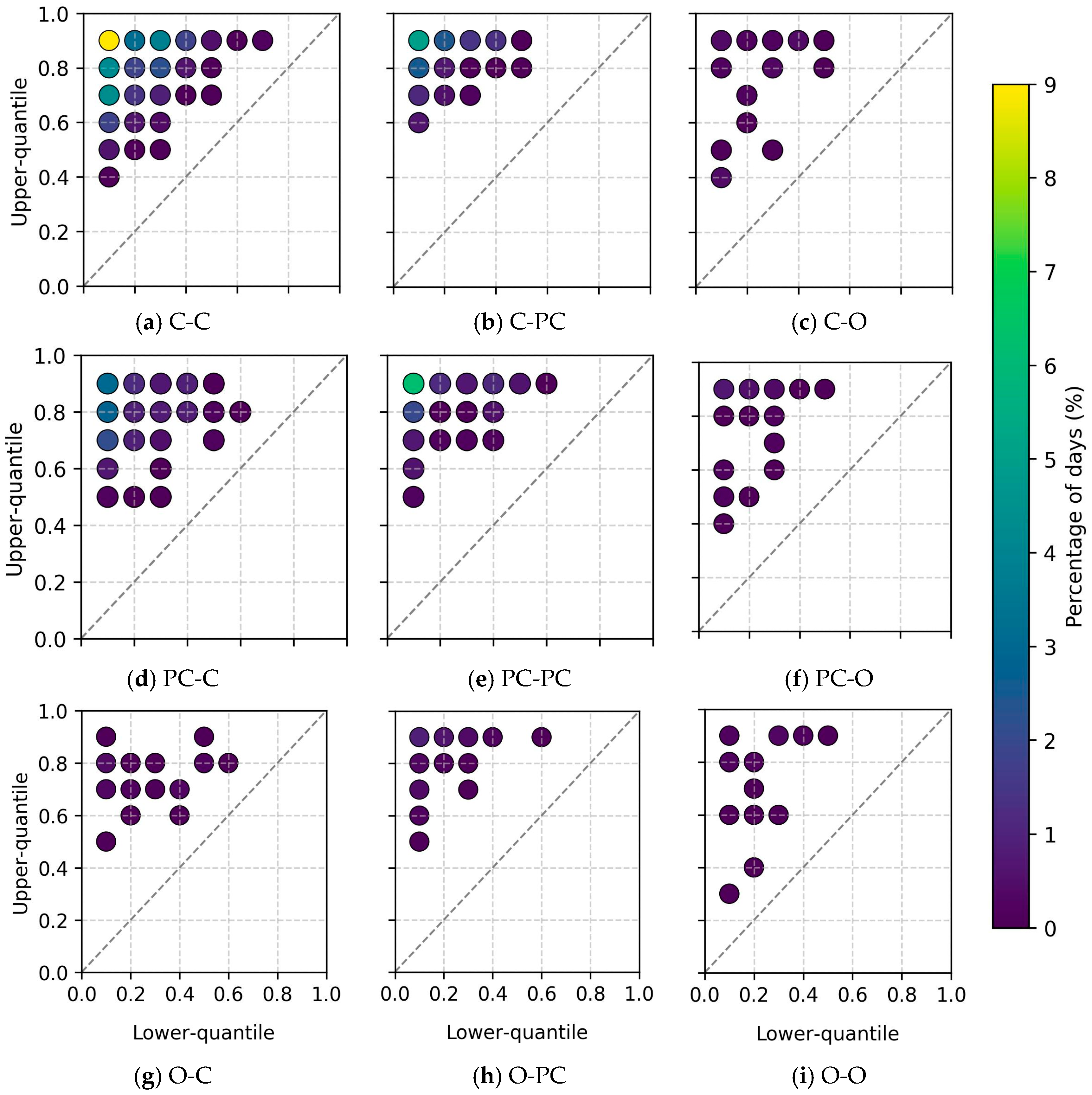 To better understand the strengths and limitations of various solar forecasting models, forecasting scenarios are defined by combining the sky conditions of the forecast day with those of the previous day. This yields nine possible two-day sky condition scenarios, as shown in Figure 3. The most frequent case is a clear day followed by another clear day, accounting for approximately 38.75%. In contrast, combinations involving overcast days are much less common—ranging from 3.60% to 1.75%—reflecting the predominance of clear skies in the dataset. The remaining transitions between clear and partly cloudy conditions collectively represent around 45.3% of the total cases.
