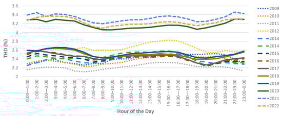 The overall increases in voltage THD values across all hours of the day between 2009 and 2010 and 2021 and 2022 may be due to the inclusion of a higher number of sites toward the ends of LV feeders, while the 2009–2010 data were highly biassed towards sites at the distribution transformer terminals. It is well accepted that voltage harmonic distortion will be higher towards the ends of feeders compared to magnitudes at the transformer terminals [32]. While it is accepted that this variation in site characteristics can impact voltage THD magnitudes, as detailed above, the number of sites included in the study is considered to be sufficient for statistical confidence in outcomes. Furthermore, the inclusion of sites at the ends of feeders would be expected to exaggerate the impacts of any injected harmonic current emissions—the data do not show this to be the case.