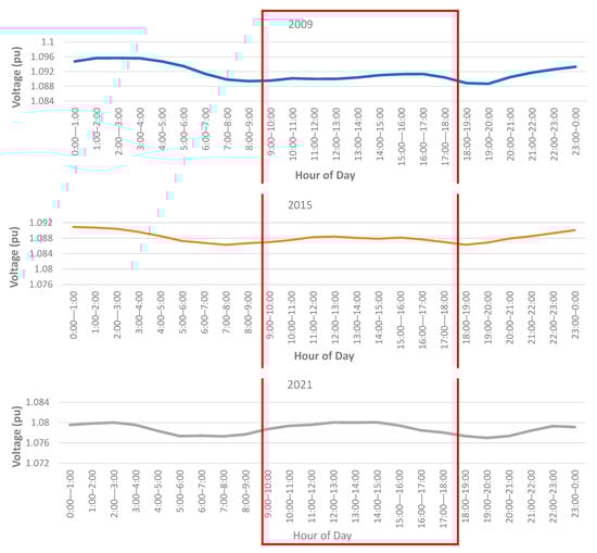 Figure 3. Hourly profile of median 99th percentile steady-state voltage indices for 2009, 2015, and 2020 on individual graphs from [29] (red box indicates peak solar generation period).