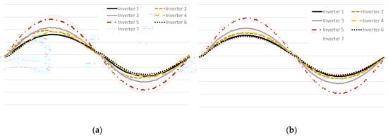 Figure 6 shows one cycle of the output current for each of the seven inverters when supplied with a sinusoidal voltage waveform for 50% and 100% of the inverter rated output power. In both cases, the waveforms appear to be quite sinusoidal, indicating that the magnitude of harmonic distortion is low. This is confirmed by the THD values, which are shown in Table 6.