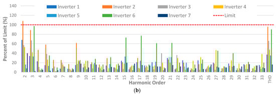 Figure 7. Current harmonic emissions normalised to AS 4777 limits: (a) 50% of rated power and (b) 100% of rated power (dashed red line indicates AS 4777 limit).