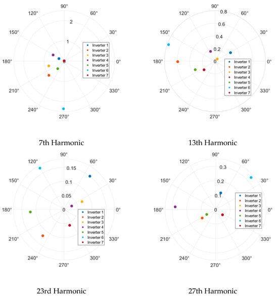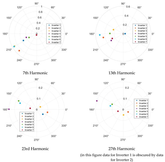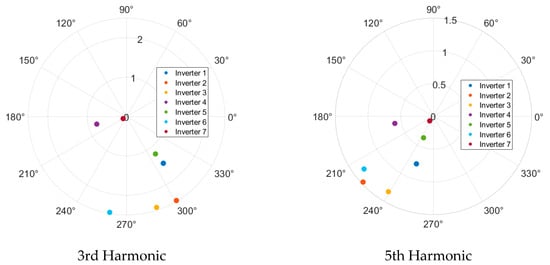• The maximum harmonic emission magnitude across all seven inverters has been used as the injected current magnitude. Table 12 shows the details of the injected emission magnitudes. The average of the measured phase angles for the 3rd, 5th, and 7th harmonic orders has been used as the indicative phase angle for use in the model. This is justified, as there is no significant phase angle variation for these harmonic orders, as indicated in Section 3 (Figure 9). The use of a single-phase angle for all inverters means that phase angles will add arithmetically, which represents the worst-case scenario.