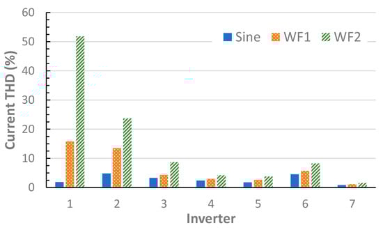 The characteristics of the supply voltage waveforms applied to the evaluated inverters are given in Table 5. The selections of phase angles for WF3 and WF4 were as per the details outlined above. The voltage THD values were 1.95% and 4.00% for WF1/WF3 and WF2/WF4, respectively.