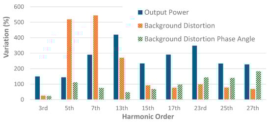 Figure 12 and Figure 13 show the average variations in harmonic current emission magnitudes and phase angles for the three operating scenarios considered in Section 3.4Section 3.6 for magnitude and phase angle respectively. These graphs allow for an easy visualisation of the operating scenario that has the largest impact on harmonic current emission characteristics. With respect to magnitude, background distortion has the most significant impact on the 5th and 7th harmonics, while output power has a larger impact for the higher-order harmonics. With respect to the phase angle, the phase angle of the background distortion has the largest impact on 5th and 7th harmonics, while the output power is more relevant for higher-order harmonics. The impact of all scenarios on the 3rd harmonic is relatively modest.