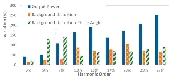 This section examines the impact of the output power magnitude on emissions. Table 7 shows harmonic current emission magnitudes (in percentage of fundamental current) and phase angles (in degrees) for selected harmonic orders for each inverter (Inv. in the table) for the evaluations conducted at 25%, 50%, 75%, and 100% of the rated active output power. The variation (Var in the table) in values is calculated for each inverter using (1).
