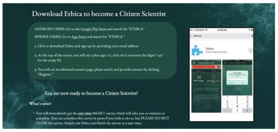 A custom-built smartphone app, adapted for the Smart Platform, was used to engage youth participants as citizen scientists to capture behaviour patterns and their relationship with mental and physical health outcomes []. Ethics approval for the Smart Platform was obtained from both the University of Regina and the University of Saskatchewan []. Following the instructions outlined in Figure 1, participants had the option to download the app using both Android and iPhone smartphones through either the Google Play Store or Apple App Store []. Youth (13–21 years) provided all data via their own smartphones, including demographic and subjective data. Previous studies have shown that smartphone apps can be used to collect valid and reliable health data in both rural and urban centres, and within diverse populations; for example, from university students and lower-income families [,,].