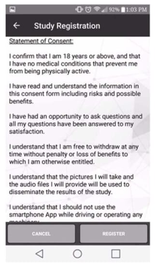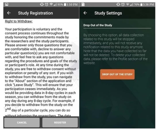 The smartphone app provided an informed consent section where youth were advised that each participant could refuse to participate in the study or withdraw from the study without any penalty at any time during the data collection cycle (Figure 3). Participants were provided clear instructions on how to withdraw from the study within the app and these instructions were available to them at all times, via the app []. Lastly, participants were asked not to change their usual smartphone carrying habits to ensure that objective smartphone phone sensor data were representative of their typical daily living conditions [].