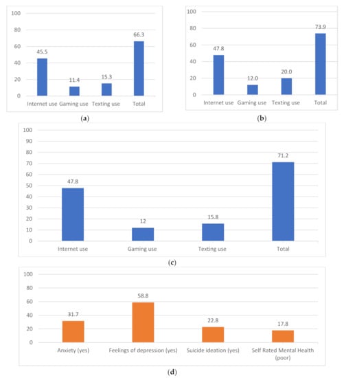 Figure 4 shows the proportion (in percent) of youth reporting high smartphone use (Figure 4a–c), poor mental health, and poor subjective health (Figure 4d). Figure 4a shows that on a typical weekday, 45.5% of participants reported using their smartphone for two hours or more for internet use; 11.4% for gaming; 15.3% for texting; and 66.3% for all behaviours combined. Figure 4b shows that on a typical weekend day, 47.8% of participants reported high smartphone internet use; 12% for gaming; 20% for texting; and 73.9% for all behaviours combined. Figure 4c shows that on a typical week, 47.8% of participants engaged in 14 or more hours of internet smartphone usage; 12.0% gaming on their smartphone; 15.8% texting; and 71.2% on all behaviours combined.