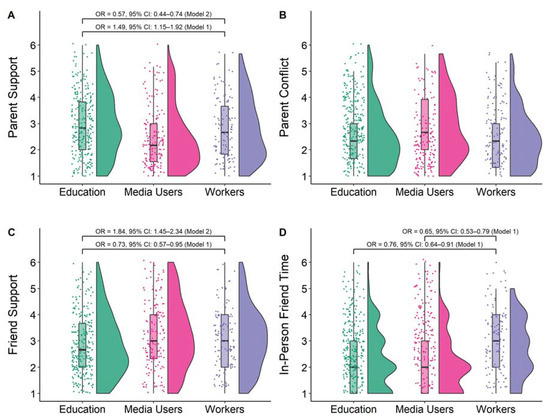 | Friend support | −0.31 | 0.16 | 0.74 * (0.56–0.96) | 0.30 | 0.17 | 1.35 (1.01–1.79) | 0.60 | 0.14 | 1.83 *** (1.45–2.31) |
