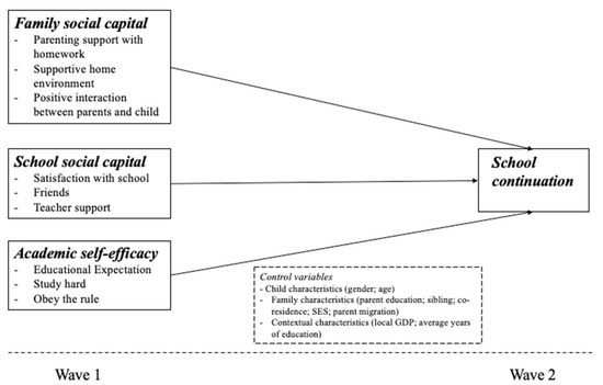 For children from disadvantaged families, leaving schools implies participation in income-generating activities or household chores that can constitute an increase in family income [4,5], therefore, poorer, rural, and male students are more likely to drop-out [3,7,8]. In the meantime, social capital has been identified as an important protective factor of children’s risk behavior. Evidence suggests that social capital generated through different networks including families, schools, and peer groups may contribute to better academic performance and prevent early school leaving [10,11,12]. In addition to the resources that children can obtain from school and family, the self-efficacy of the children may also be associated with their willingness to remain in school [13].