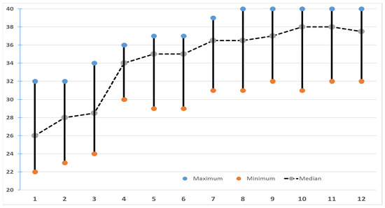 The median, maximum and minimum musical efficacy scores for the group of mentors over the 12 months of training (n = 14).