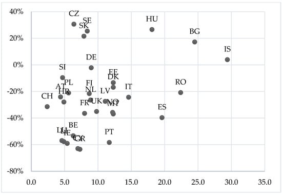 The share of early school leavers also varies widely across countries (see Figure 2) and does not necessarily correlate with high shares of rural youth. Iceland (29.4pp), Bulgaria (24.5pp), and Romania (22.4pp) make up the group of countries with the highest early-school-leaving rates in 2019. The lowest rate is found in Switzerland with 2,4pp. From 2010 to 2019, Czechia (+30.6%), Hungary (+26.57%), Sweden (+25.37%), and Slovakia (+21.54%) were the countries with the highest increase in early-school-leaving rates. With the exception of Hungary, however, these countries remained below the 10% mark. From 2010 to 2019, a different group of states experienced a sharp decline in their early-school-leaving rates. These include Greece (−63.5%), Cyprus (−62.9%), Ireland (−59.09%), Portugal (−58.36%), Lithuania (−57.7%), Luxembourg (−57.01%), and Belgium (−53.33%). With the exception of Portugal, all countries in this group made it below the 10% mark during this period. Overall, in 2019, 19 of the 31 states achieved the EU target of an early-school-leaving rate below 10%.