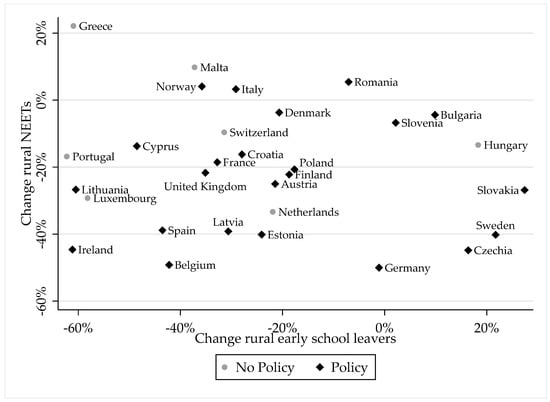 Relative change in percentage points of early school leavers (18–24 years) and NEETs (15–24 years) in rural areas 2010–2019 and policies on the education of rural youth. Source: Eurostat 2020, [edat_lfse_29] and [edat_lfse_30], own calculations.
