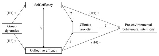 Based on past research, we were able to form hypotheses regarding relationships between some of the constructs under study. In other cases, previous studies provided mixed results and we had no firm expectations. First, cohesive and efficient group dynamics should be related to both increased environmental self- (H1) and collective efficacy (H2). Based on previous studies on the topic, both may be related positively to each other [13] or not [39], and are expected to be related to stronger intentions to act for the environment H3 and H4 [36,37]. How efficacy beliefs and climate anxiety are related to each other, and how simultaneously considering anxiety and efficacy constructs impacts pro-environmental intentions remain to be examined, since research on the topic has produced mixed results so far [9,12].
