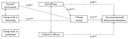Then, expectations regarding the relationships between climate anxiety and the other variables of the model were more open (see Figure 1). We found that self-efficacy was related to higher levels of climate anxiety, while the relationship between collective efficacy and the latter was not significant (β = 0.12, p = 0.13). In addition, climate anxiety was also related to stronger pro-environmental intentions. Finally, the two following indirect paths yielded significant estimates: involvement in group work—climate anxiety—behavioral intentions (β = 0.04, p = 0.05), and self-efficacy—climate anxiety—behavioral intentions (β = 0.06, p = 0.03).