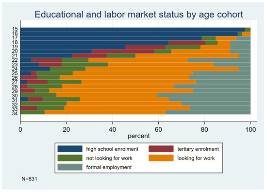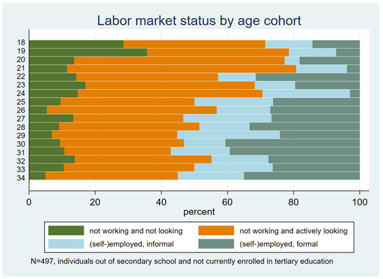 Figure 1 displays the shares of persons in each of these categories by age cohort (including those still attending secondary school). The figures display a low rate of school dropout before finishing grade 12. At the same time, a large proportion of youth was neither absorbed into the formal labor market nor into the tertiary education sector. The majority of youth falls into the gap between tertiary education and the formal labor market. The proportion of NEETs increases as the proportion of secondary school attendees decreases until about age 24 and stays at around 65% from there onward.