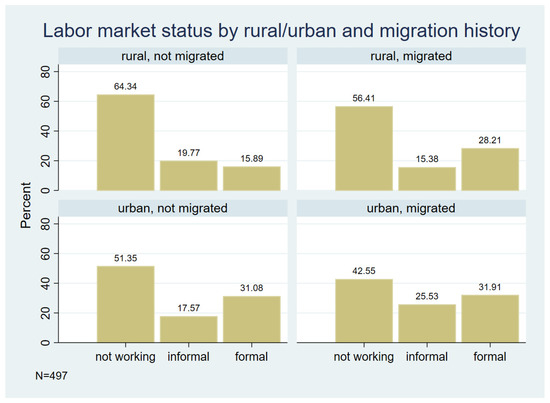 Informal economic activity seems to be an alternative only for a minority. Of those neither enrolled in tertiary education nor in formal employment or formal self-employment, only about 24% engage in informal employment or self-employment (see Table 6). Figure 2 zooms in on those out of school and includes informal labor market activity as an additional category. With respect to spatial considerations, Figure 3 depicts labor market status by rural and urban residence and by migration within the past five years. Urban residents and persons who migrated within the past five years are about twice as likely to be in formal employment than not-migrated rural residents (about 16% versus about 30%). The differences with respect to the informal sector are less pronounced. The percentage of persons engaged in informal labor market activity is about one-third higher among the urban or migrated than in the other categories. The percentage of youth not working is highest among the rural or not-migrated (64%), followed by rural or migrated (56%) and urban or not-migrated (51%), with the lowest value in the urban or migrated graph (43%). From the descriptive analysis, hence, it seems that urban residence is a labor market advantage and that migration into an urban area is a possible strategy for youth to increase their chances of informal- and formal-sector employment.