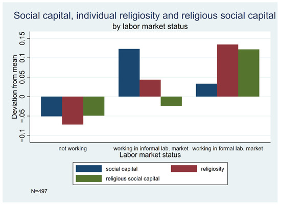 Figure 4 displays the deviation from the mean of social capital, individual religiosity, and religious social capital according to labor market status. On average, youth not working have lower values of all three variables. Values of social capital are highest among those in the informal labor market, potentially indicating that access to social networks is conducive to informal economic activity. The mean values of individual religiosity and religious social capital are highest among those in formal employment, deviating from the mean by 12% and 13% of the standard deviations, respectively.