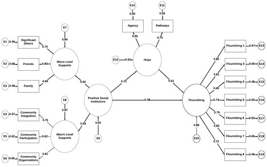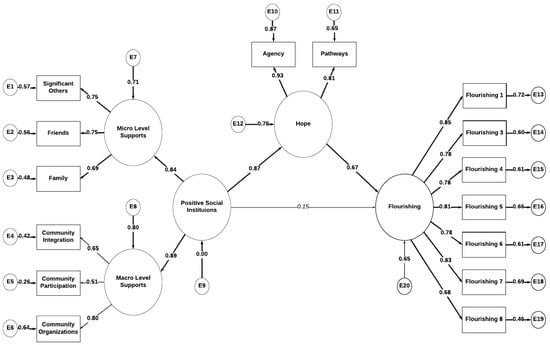 Standardized path coefficients for cisgender-heterosexual. Notes: path from X (positive social institutions) to Y (flourishing) not statistically significant p > 0.05. All other values significant p < 0.001.