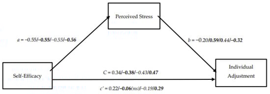 Results of the Mediator Model Testing among self-efficacy, perceived stress, and individual adjustment. Note: Four unstandardized coefficients are listed to show results for four adjustment indicators. The first is for academic satisfaction, the second (in bold) is for depressive symptoms, the third (in italics) is for loneliness, and the fourth (in italics and bold) is for subjective physical health. C = total effect of independent variable (IV) on dependent variable (DV); a = IV to mediator; b = direct effect of mediator on DV; c’ = direct effect of IV on DV. All p < 0.001, unless noted otherwise.